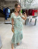 Vestido em chiffon, decote em V, estampado; babado na barra;