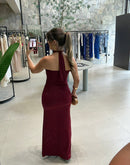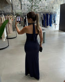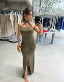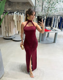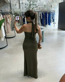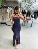 Vestido longo em malha fria, gola com amarração no pescoço, franzido na cintura, fenda na frente; contém forro;
