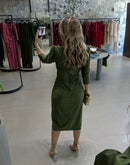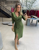 Vestido midi em malha jersey com decote em V, manga 3/4 com ombreiras; Com bojo: Zíper atrás; Pequena fenda na lateral;