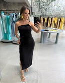 Vestido midi um ombro só com alça e detalhe dourado; fenda lateral; ziper atrás