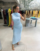 Vestido midi em crepe, regata, gola godê; ziper atrás; detalhe drapeado na cintura;