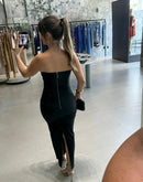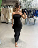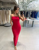 Vestido midi tomara que caia em viscose, liso, ziper atrás, fenda atrás;