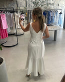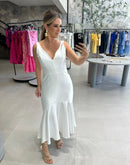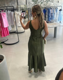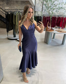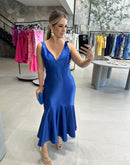 Vestido midi em tecido acetinado, sem mangas e saia enviesada