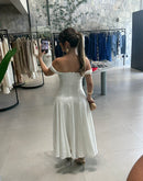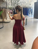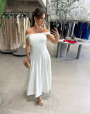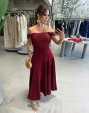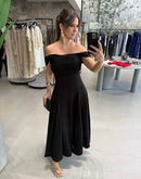 Vestido midi ombro a ombro, busto em tule, saia em crepe; ziper atrás;