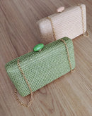 Clutch em palha com alça dourada, fecho na cor bege; Espaço ideal para colocar celular, documentos e maquiagem.