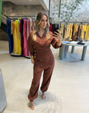 Conjunto em linho com a blusa transpassada; decote em V e com amarração;