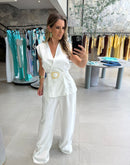 Macacão com balzer e calça, acompanha cinto, não contém bolsos;