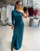 Vestido longo de malha, um ombro com manga longa, detalhe de nó na lateral; Fenda na lateral.