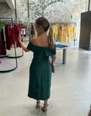 Vestido midi em zibeline, ombro a ombro, busto transpassado; com bojo; ziper atrás; com forro;