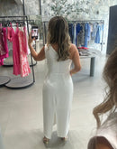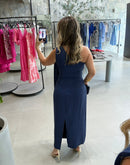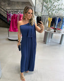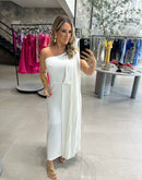 Vestido longuete um ombro só com detalhe drapeado na lateral; Zíper na lateral;
