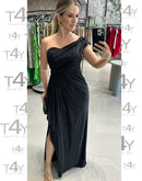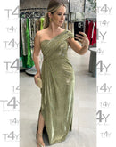 Vestido longo em lurex, tecido de brilho, tomara que caia com faixa transpassada de um ombro.